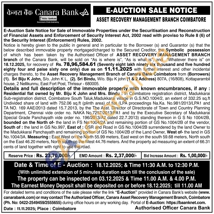 Details and full description of the immovable property with known encumbrances, if any: Residential flat owned by Mr. Biju K John and Mrs. Bindu: In Coimbatore registration district, Madukkarai Sub-registration district, Coimbatore South Taluk, Madukkarai village in G.S.NO.1004/2, an extent of 332.25 sq.ft Undivided share of land with 752.06 sq.ft (plinth area) of flat (LPA proceedings Na.Ka. No.981/2013/LPA1 and ΤΑ ΝΟ. 169 ΑΑE/2013 dated 15.7.2013, by the The Asst. Director of Directorate of Town and Country Planning Department, Chennai vide order no. NAKA No.7257/2013/PA1 and by the Executive Secretary of Madukkarai Special Grade Panchayath vide order no. 196/2013/A2 dated 22.7.2013) standing thereon in G S No 1004/2B, bounded on the North of the land in FS No.1004/2A and remaining portion of GS No.1004/2B of the vendor, South of the land in GS No.997, East of: OSR and Road in GS No.1004/2B surrendered by the land Owner to the Madukkarai Panchayath and remaining portion of GS No.1004/2B of the Land Owner, West of- the land in GS No.1004/3A. Measuring: East West on the North 55.99 meters, East west on the south 59.68 meters, North south on the East 46.20 meters, North south on the West 44.76 meters. And the property ad measuring an extent of 66.31 cents of land together with right to use the road