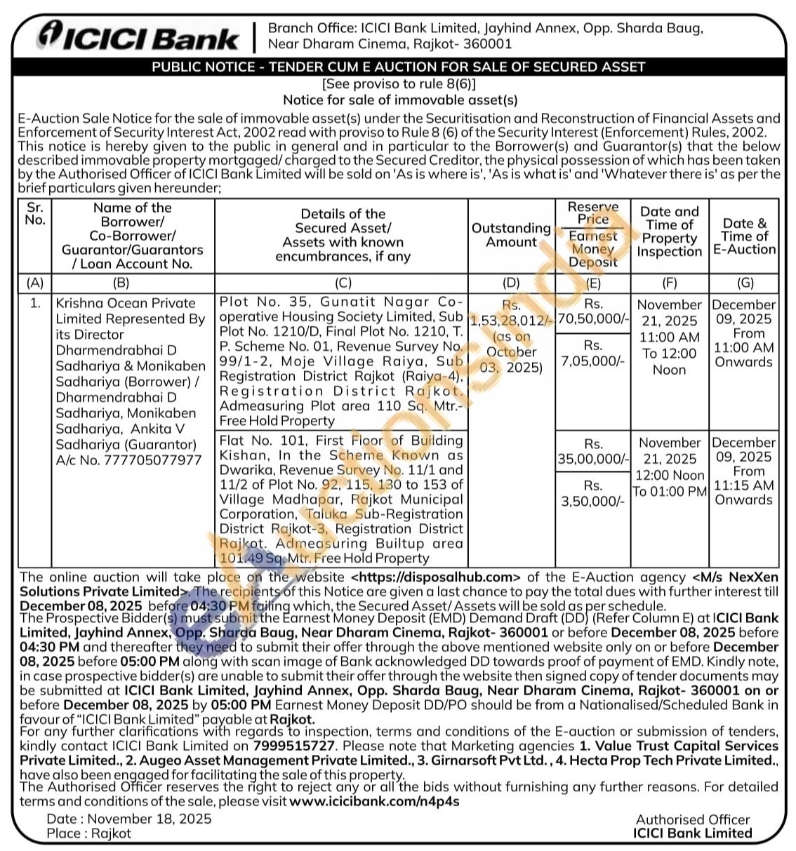 Plot No. 35, Gunatit Nagar Co-operative Housing Society Limited, Sub Plot No. 1210/D, Final Plot No. 1210, Τ. P. Scheme No. 01, Revenue Survey No. 99/1-2, Moje Village Raiya, Sub Registration District Rajkot (Raiya-4), Registration District Rajkot. Admeasuring Plot area 110 Sq. Mtr.-Free Hold Property