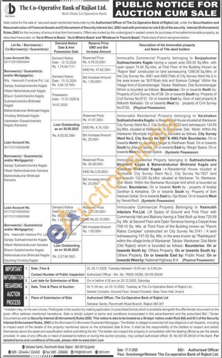 Immovable Commercial Property belonging to Sanjaykumar Subhaschandra Kagda having a carpet area 555.00 Sq.Mtrs, with open space 74.54 Sq.mtrs, at First Floor of the Building Known as "Rajavir Mall" constructed on land asmeasuring 1288.08 Sq.Mtrs. of the City Survey No. 4061 and 4062 Paiki of City Survey Ward No.2 in the area known as "M.P.Shah Arts and Science College Within the Village limit of Surendranagar, Taluka: Wadhwan, Dist. Surendranagar Which is bounded as follows: Boundaries: On or towards North by: Property of Civil Survey No.6736. On or towards South by: Property of Civil Survey No.6731. On or towards East by: Door of said property & Nilkanth Mahadev. On or towards West by: property of Civil Survey No.6726. (Physical Possession)