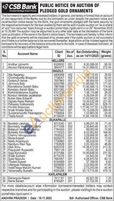CSB Bank Gold Auctions Auction in Nellore