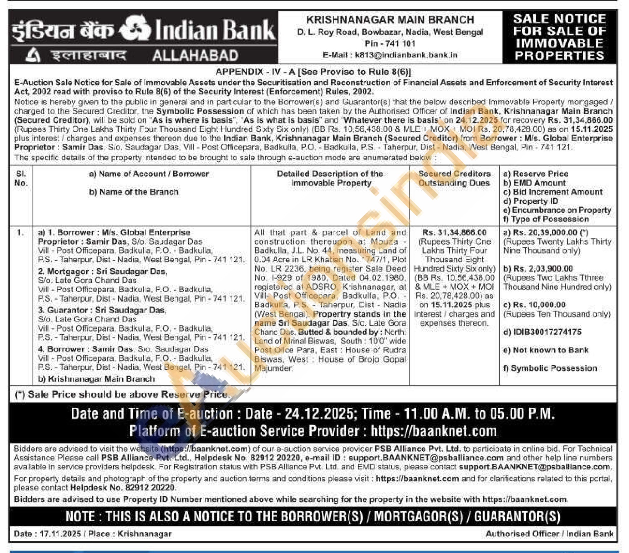 All that part & parcel of Land and construction thereupon at Mouza Badkulla, J.L. No. 44, measuring Land of 0.04 Acre in LR Khatian No. 1747/1, Plot No. LR 2236, being register Sale Deed No. 1-929 of 1980, Dated 04.02.1980, registered at ADSRO, Krishnanagar, at Vill- Post Officepara, Badkulla, P.O. Badkulla, P.S. Taherpur, Dist - Nadia (West Bengal). Propertry stands in the name Sri Saudagar Das, S/o. Late Gora Chand Das. Butted & bounded by: North: Land of Mrinal Biswas, South: 10'0" wide Post Olice Para, East: House of Rudra Biswas, West House of Brojo Gopal Majumder.