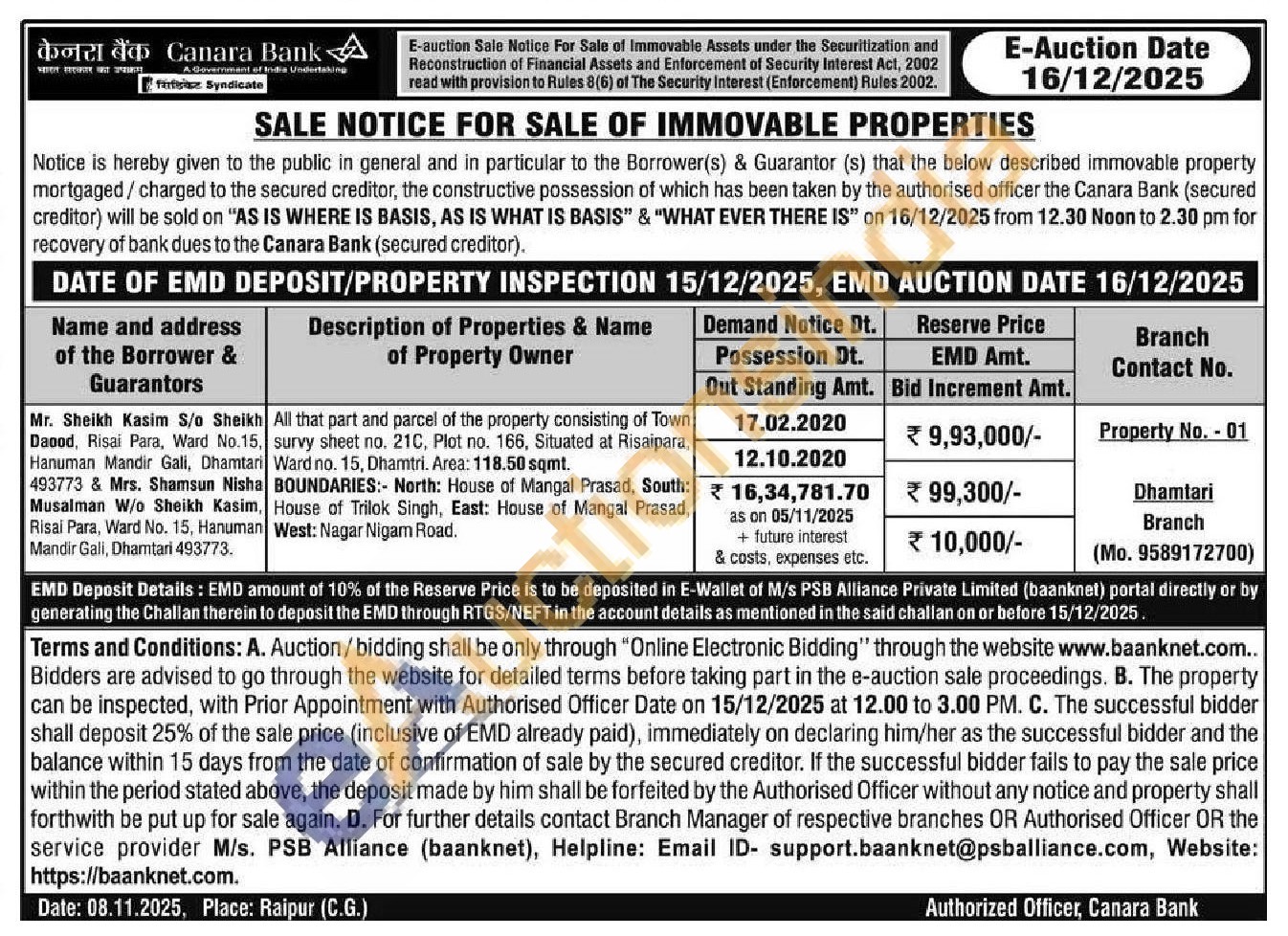 All that part and parcel of the property consisting of Town survy sheet no. 21C. Plot no. 166, Situated at Risaipara, Ward no. 15, Dhamtri. Area: 118.50 sqmt. BOUNDARIES:- North: House of Mangal Prasad, South: House of Trilok Singh, East: House of Mangal Prasad, West: Nagar Nigam Road