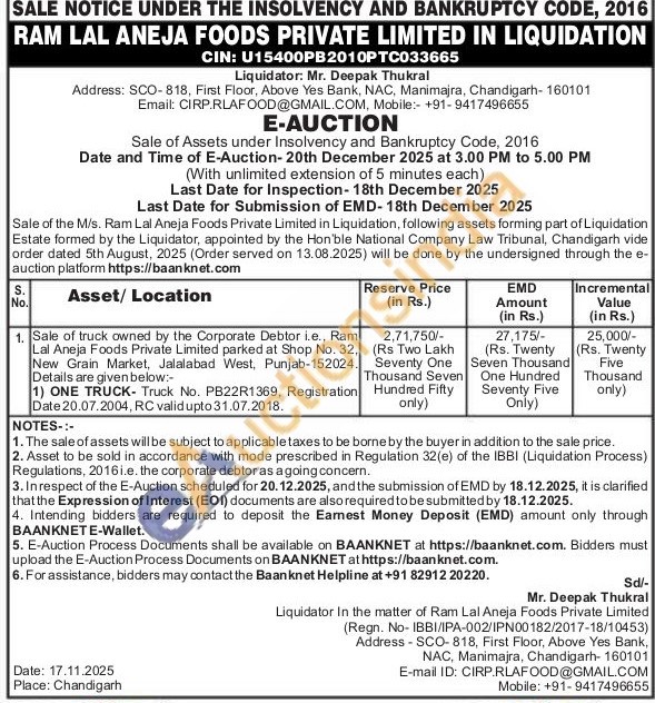 Sale of truck owned by the Corporate Debtor i.e., Ram Lal Aneja Foods Private Limited parked at Shop No. 32. New Grain Market, Jalalabad West, Punjab-152024.