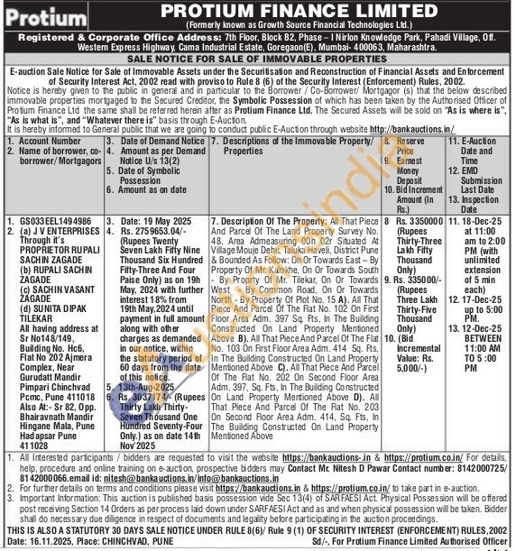 Description Of The Property: All That Piece And Parcel Of The Land Property Survey No. 48. Area Admeasuring 00h 02r Situated At Village Mouje Dehu, Taluka Haveli, District Pune & Bounded As Follow: On Or Towards East -By Property Of Mr. Kalokhe, On Or Towards South By Proprty Of Mr. Tilekar, On Or Towards West By Common Road, On Or Towards North By Property Of Plot No. 15 A). All That Piece And Parcel Of The Flat No. 102 On First Floor Area Adm. 397 Sq. Fts, In The Building Constructed On Land Property Mentioned Above B). All That Piece And Parcel Of The Flat No. 103 On First Floor Area Adm. 414 Sq. Fts, In The Building Constructed On Land Property Mentioned Above C). All That Piece And Parcel Of The Flat No. 202 On Second Floor Area. Adm. 397, Sq. Fts, In The Building Constructed On Land Property Mentioned Above D). All That Piece And Parcel Of The Flat No. 203. On Second Floor Area Adm. 414, Sq. Fts, In The Building Constructed On Land Property Mentioned Above