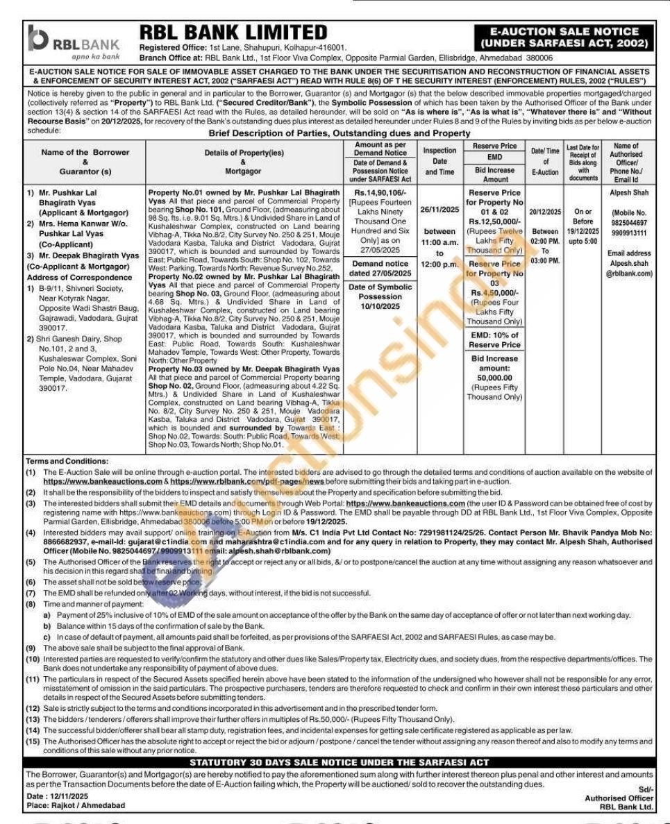 All that piece and parcel of Commercial Property bearing Shop No. 02, Ground Floor, (admeasuring about 4.22 Sq. Mtrs.) & Undivided Share in Land of Kushaleshwar Complex, constructed on Land bearing Vibhag-A, Tikka No. 8/2, City Survey No. 250 & 251, Mouje Vadodara Kasba, Taluka and District Vadodara, Gujrat 390017, which is bounded and surrounded by Towards East: Shop No.02, Towards: South: Public Road, Towards West Shop No.03, Towards North: Shop No.01