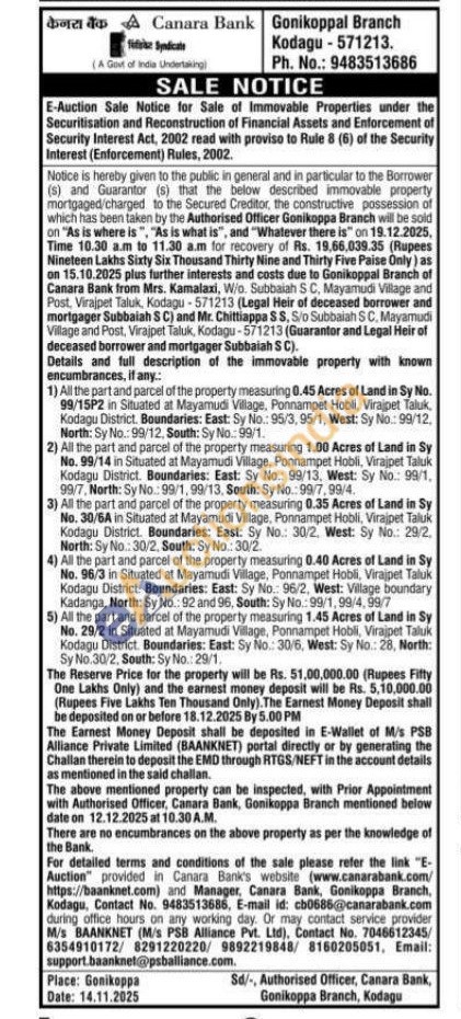 1) All the part and parcel of the property measuring 0.45 Acres of Land in Sy No. 99/15P2 in Situated at Mayamudi Village, Ponnampet Hobli, Virajpet Taluk, Kodagu District. Boundaries: East: Sy No.: 95/3, 95/1, West: Sy No.: 99/12, North: Sy No.: 99/12, South: Sy No.: 99/1. 2) All the part and parcel of the property measuring 1.00 Acres of Land in Sy No. 99/14 in Situated at Mayamudi Village, Ponnampet Hobli, Virajpet Taluk Kodagu District. Boundaries: East: Sy No.: 99/13, West: Sy No.: 99/1, 99/7, North: Sy No: 99/1, 99/13, South: Sy No. : 99/7, 99/4. 3) All the part and parcel of the property measuring 0.35 Acres of Land in Sy No. 30/6A in Situated at Mayamudi Village, Ponnampet Hobli, Virajpet Taluk Kodagu District. Boundaries: East: Sy No.: 30/2, West: Sy No.: 29/2, North: Sy No.: 30/2, South: Sy No.: 30/2. 4) All the part and parcel of the property measuring 0.40 Acres of Land in Sy No. 96/3 in Situated at Mayamudi Village, Ponnampet Hobli, Virajpet Taluk Kodagu District. Boundaries: East: Sy No.: 96/2, West: Village boundary Kadanga, North: Sy No.: 92 and 96, South: Sy No.: 99/1, 99/4,99/7 5) All the part and parcel of the property measuring 1.45 Acres of Land in Sy No. 29/2 in Situated at Mayamudi Village, Ponnampet Hobli, Virajpet Taluk Kodagu District. Boundaries: East: Sy No.: 30/6, West: Sy No.: 28, North: Sy No.30/2, South: Sy No.: 29/1.