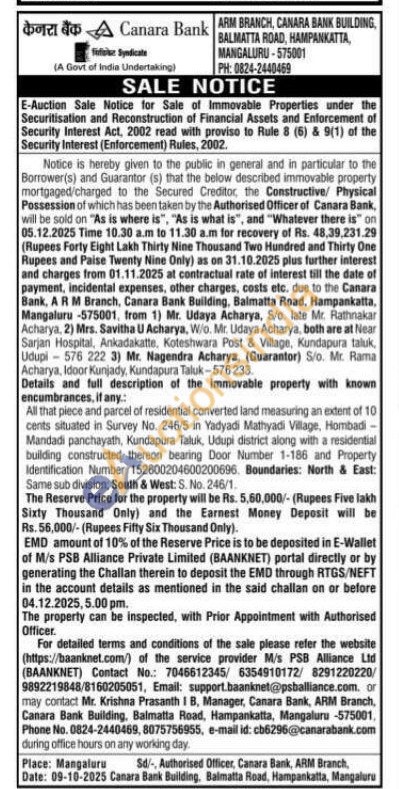 All that piece and parcel of residential converted land measuring an extent of 10 cents situated in Survey No. 246/5 in Yadyadi Mathyadi Village, Hombadi Mandadi panchayath, Kundapura Taluk, Udupi district along with a residential building constructed thereon bearing Door Number 1-186 and Property Identification Number 152600204600200696. Boundaries: North & East: Same sub division: South & West: S. No. 246/1
