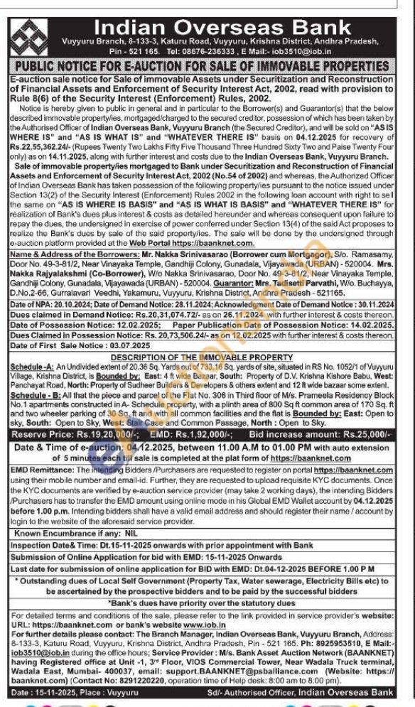 Schedule-A: An Undivided extent of 20.36 Sq. Yards out of 733.16 Sq. yards of site, situated in RS No. 1052/1 of Vuyyuru Village, Krishna District, is Bounded by: East: 4 ft wide Bazaar, South: Property of D.V. Krishna Kishore Babu, West: Panchayat Road, North: Property of Sudheer Builders & Developers & others extent and 12 ft wide bazaar some extent. Schedule B: All that the piece and parcel of the Flat No. 306 in Third floor of M/s. Prameela Residency Block No. 1 apartments constructed in A- Schedule property, with a plinth area of 800 Sq ft common area of 170 Sq. ft and two wheeler parking of 30 Sq. ft and with all common facilities and the flat is Bounded by: East: Open to sky, South: Open to Sky, West: Stair Case and Common Passage, North: Open to Sky.