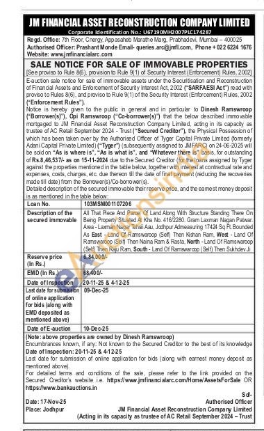 All That Piece And Parcel Of Land Along With Structure Standing There On Being Property Situated At Khe No. 416/2280. Gram Laxman Nagan Patwar Area-Laxman Nagar Tehsi Aau. Jodhpur Admeasuring 17434 Sq Ft. Bounded As East-Land Of Ramswaroop (Self) Then Kishan Ram, West-Land Of Ramswaroop (Self Then Naina Ram & Rasta. North-Land Of Ramswaroop (Selfi Then Raju Ram, South-Land Of Ramawar cop (Self) Then Sukhdev Ji