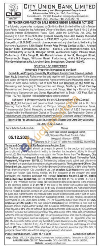 Schedule A (Property Owned By Mis. Stephil French Fries Private Limited) Item No.2: [Leasehold Rights over the land together with Superstructure) All the piece and parcel of Property being the leasehold Rights over the Land Measuring extent of 70 Cents or there above forming Part of Item No.1 and Bounded on the North by-Remaining land belonging to Sampoornam and Ganga, South by Road, East by-Remaining land belonging to Sampoomam and Ganga, West by Remaining land belonging to Sampoornam and Ganga Measuring North to South-305 Feet, East to West-100 Feet Together with superstructure existing thereon Schedule-B (Property Owned By Mrs. G.Sampoornam & Mrs Ganga) Item No.1: All that piece and parcel of land comprised in Old S.No.2/4 A. R.S.No.5 bearing Patta No.31, situated at Vaippur Village, Thiruvannamalai Taluk Thiruvannamalai District Measuring at extent of 4.58 Acres of 1.85.5 Hectares and situated within the Registration District, of Tiruvannamalai, Sub-Registration District of Vattavalum and lying within Keezhponnathor Panchayat Union and Vaippur Panchayat