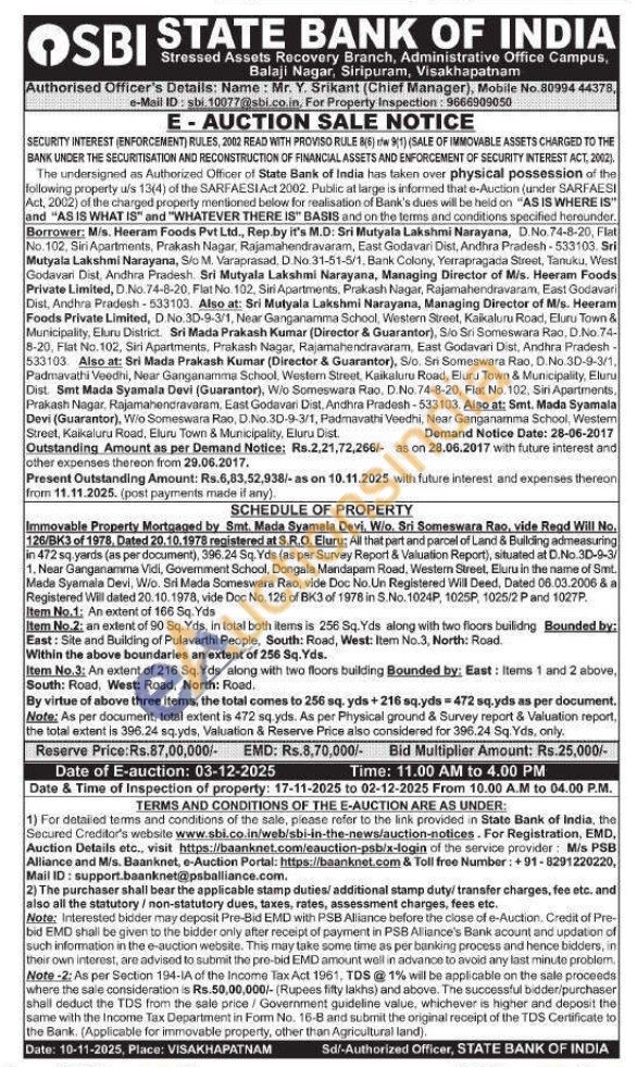 126/BK3 of 1978, Dated 20,10, 1978 registered at S.R.O. Eluru: All that part and parcel of Land & Building admeasuring in 472 sq. yards (as per document), 396.24 Sq. Yds (as per Survey Report & Valuation Report), situated at D.No. 3D-9-3/1. Near Ganganamma Vidi, Govemment School, Dongala Mandapam Road, Western Street, Eluru in the name of Smt. Mada Syamala Devi, W/o. Sri Mada Someswara Rao, vide Doc No. Un Registered Will Deed, Dated 06.03.2006 & a Registered Will dated 20.10.1978, vide Doc No. 126 of BK3 of 1978 in S.No. 1024P, 1025P, 1025/2 P and 1027P. Item No.1: An extent of 166 Sq. Yds