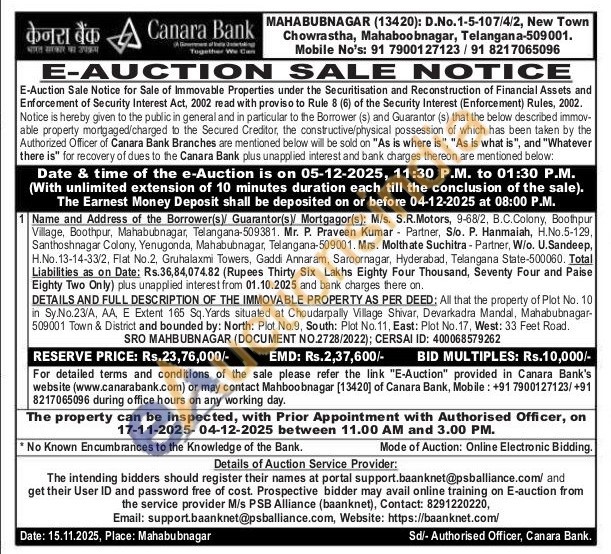 DETAILS AND FULL DESCRIPTION OF THE IMMOVABLE PROPERTY AS PER DEED: All that the property of Plot No. 10 in Sy.No.23/A, AA, E Extent 165 Sq. Yards situated at Choudarpally Village Shivar, Devarkadra Mandal, Mahabubnagar-509001 Town & District and bounded by: North: Plot No.9, South: Plot No.11, East: Plot No. 17, West: 33 Feet Road.