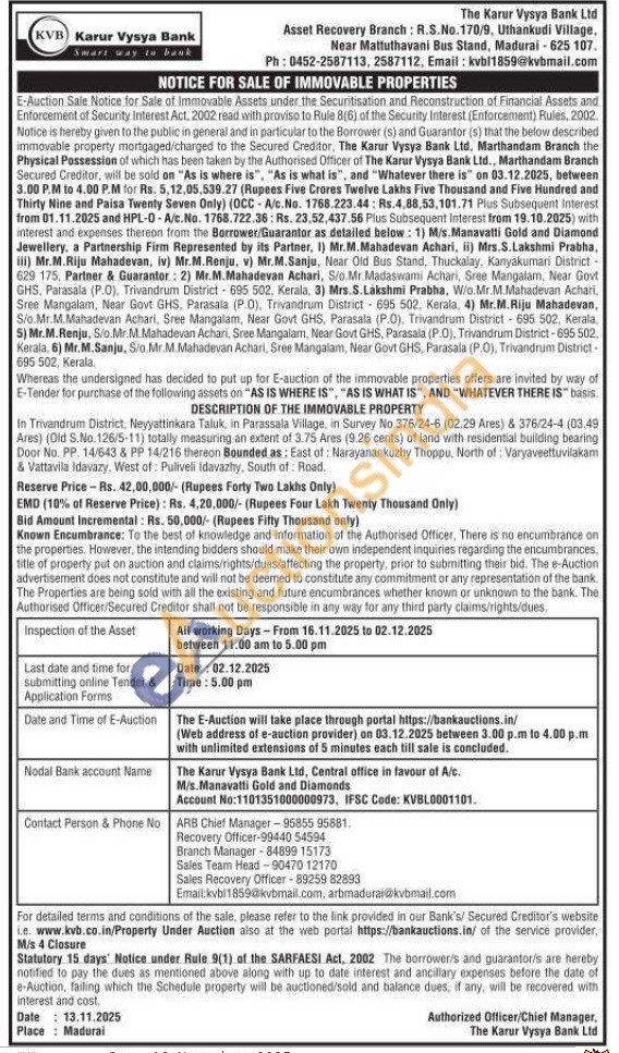 In Trivandrum District, Neyyattinkara Taluk, in Parassala Village, in Survey No.376/24-6 (02.29 Ares) & 376/24-4 (03.49 Ares) (Old S.No. 126/5-11) totally measuring an extent of 3.75 Ares (9.26 cents) of land with residential building bearing Door No. PP. 14/643 & PP 14/216 thereon Bounded as: East of: Narayanankuzhy Thoppu, North of Varyaveettuvilakam & Vattavila Idavazy, West of: Puliveli Idavazhy, South of: Road.