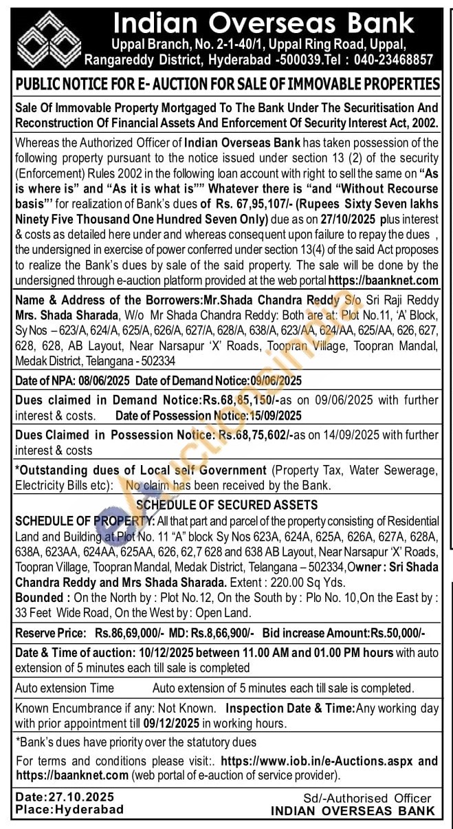 SCHEDULE OF PROPERTY: All that part and parcel of the property consisting of Residential Land and Building at Plot No. 11 "A" block Sy Nos 623A, 624A, 625A, 626A, 627A, 628A, 638A, 623AA, 624AA, 625AA, 626, 62,7 628 and 638 AB Layout, Near Narsapur 'X' Roads, Toopran Village, Toopran Mandal, Medak District, Telangana -502334, Owner: Sri Shada Chandra Reddy and Mrs Shada Sharada. Extent: 220.00 Sq Yds.