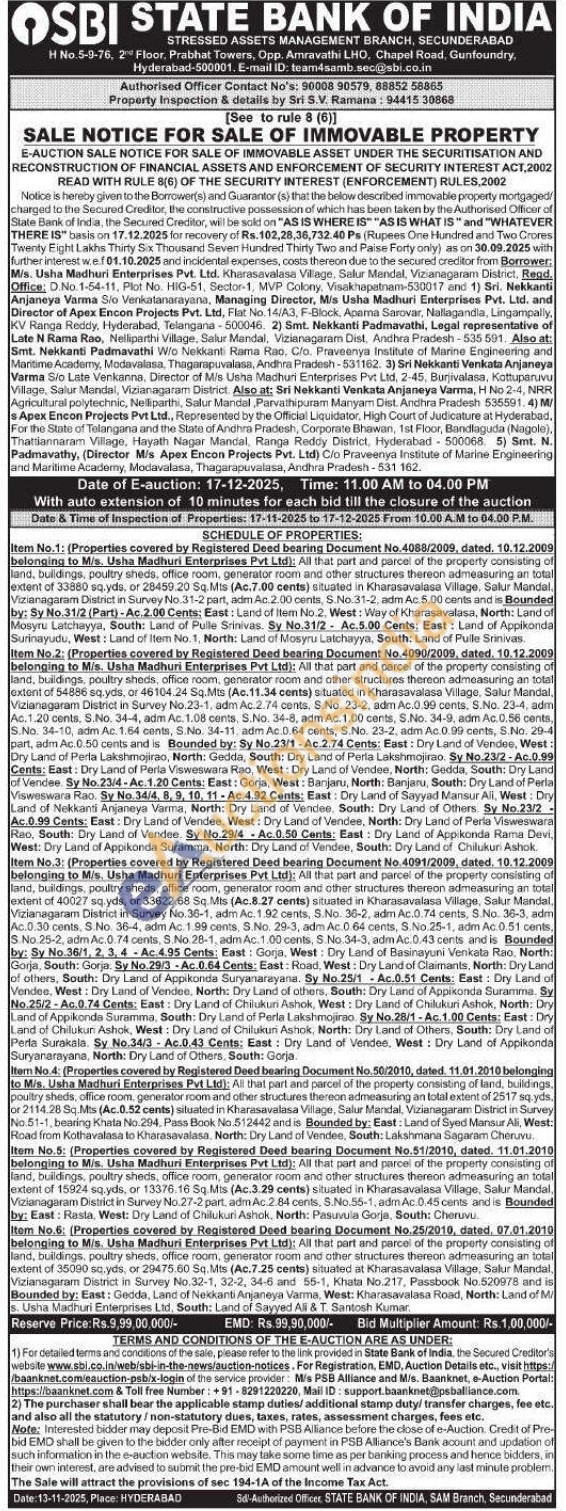 Item No.6: (Properties covered by Registered Deed bearing Document No.25/2010, dated. 07.01.2010 belonging to Mis. Usha Madhuri Enterprises Pvt Ltd): All that part and parcel of the property consisting of land, buildings, poultry sheds, office room, generator room and other structures thereon admeasuring an total extent of 35090 sq.yds, or 29475.60 Sq.Mts (Ac.7.25 cents) situated at Kharasavalasa Village, Salur Mandal, Vizianagaram District in Survey No.32-1, 32-2, 34-6 and 55-1, Khata No.217, Passbook No.520978 and is Bounded by: East: Gedda, Land of Nekkanti Anjaneya Varma, West: Kharasavalasa Road, North: Land of M s. Usha Madhuri Enterprises Ltd, South: Land of Sayyed All & T. Santosh Kumar