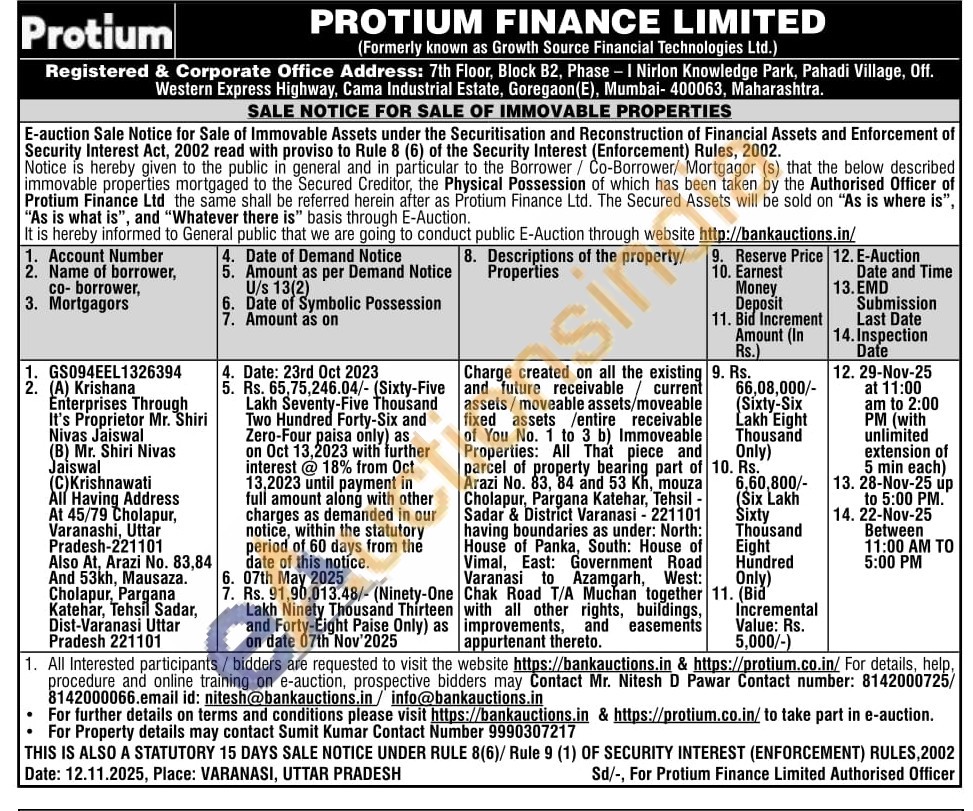 All That piece and parcel of property bearing part of Arazi No. 83, 84 and 53 Kh, mouza Cholapur, Pargana Katehar, Tehsil -Sadar & District Varanasi - 221101 having boundaries as under: North: House of Panka, South: House of Vimal, East: Government Road Varanasi to Azamgarh, West: Chak Road T/A Muchan together with all other rights, buildings, improvements, and easements appurtenant thereto.