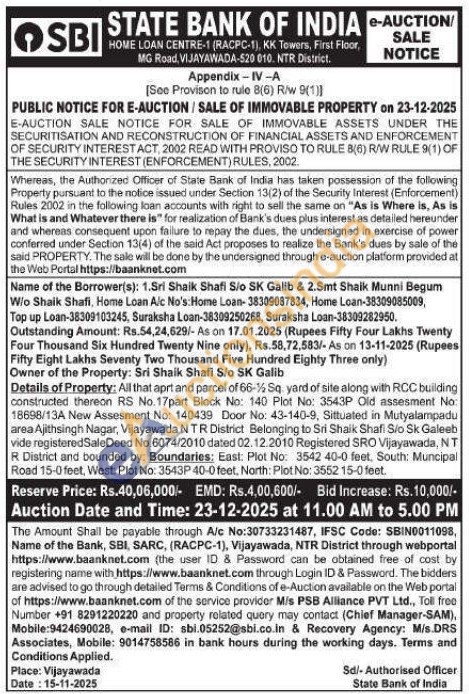 Details of Property: All that aprt and parcel of 66-1/2 Sq. yard of site along with RCC building constructed thereon RS No.17part Block No: 140 Plot No: 3543P Old assesment No: 18698/13A New Assesment No: 140439 Door No: 43-140-9, Sittuated in Mutyalampadu area Ajithsingh Nagar, Vijayawada NTR District Belonging to Sri Shaik Shafi Sio Sk Galeeb vide registeredSaleDeed No.6074/2010 dated 02.12.2010 Registered SRO Vijayawada, NT R District and bounded by: Boundaries: East: Plot No: 3542 40-0 feet, South: Muncipal Road 15-0 feet, West: Plot No: 3543P 40-0 feet, North: Plot No: 3552 15-0 feet
