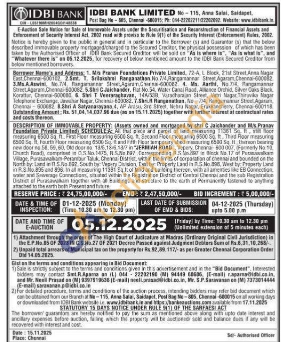 DESCRIPTION OF IMMOVABLE PROPERTY: (Assets owned and mortgaged by shri C Jaichander and Mis. Pranav Foundation Private Limited) SCHEDULE:A: All that piece and parcel of land measuring 11361 Sq. ft, stilt floor measuring 6500 Sq. ft., First Floor measuring 6500 Sq. ft. Second Floor measuring 6500 Sq. ft. Third Floor measuring 6500 Sq. ft, Fourth Floor measuring 6500 Sq. ft and Fifth Floor temporary shed measuring 6500 Sq. ft, thereon bearing new door no. 58, 59, 60, Old door no. 13/5,13/6,13/7 in "JERMIAH ROAD", Vepery, Chennai-600 007, (Formerly No. 10, Church Road), comprised in D.S.No. 1475, R.S.No.897, Corresponding R.S.No.897 in Block No.17 of Purasawalkam Village, Purasawalkam-Perambur Taluk, Chennai District, within the limits of corporation of chennai and bounded on the North by: Land in R.S. No 892, South by. Vepery Division, East by: Property Land in R.S.No. 898, West by: Property Land in R.S.No.895 and 896. In all measuring 11361 Sq.ft of land and building thereon, with all amenties like EB Connection, water and Sewerage Connections, situated within the Registration District of Central Chennai and the sub Registration District of Purasawalkam together with all Buildings and structure to the earth of Permanently fastened to anything attached to the earth both Present and future.