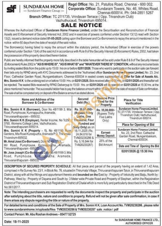 DESCRIPTION OF SECURED PROPERTY: SCHEDULE: All that piece and parcel of the property having an extent of 1.42 Ares, comprised in Re Survey No. 23/1, in Block No. 76, situated in Thirumala Village, Thiruvananthapuram Taluk,in Thiruvananthapuram District, along with all the fittings and appurtenant thereto and bounded on the East by: Property of Velukutty and Baiju, North by: Pathway, West by: Property of Dayana and South by: 3 Meter wide Private Road and Property of Stephan, within the Registration District of Thiruvananthapuram and Sub Registration District of Chalai which is more fully and particularly described in the Title Deed No.561/2017
