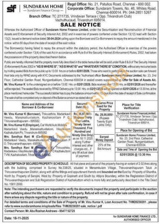 DESCRIPTION OF SECURED PROPERTY: SCHEDULE: All that piece and parcel of the property having an extent of 2.02 Ares along with the building, comprised in Survey No.338/25, situated in Menamkulam Village, Thiruvananthapuram Taluk in Thiruvananthapuram District, along with all the fittings and appurtenant thereto and bounded on the East by: Property of Shantha, North by: Property of Sarojini, West by: Property of Gopinath and South by: Attipra Boundary, within the Registration District of Thiruvananthapuram and Sub Registration District of Kazhakuttom which is more fully and particularly described in the Title Deed No. 1561/2000