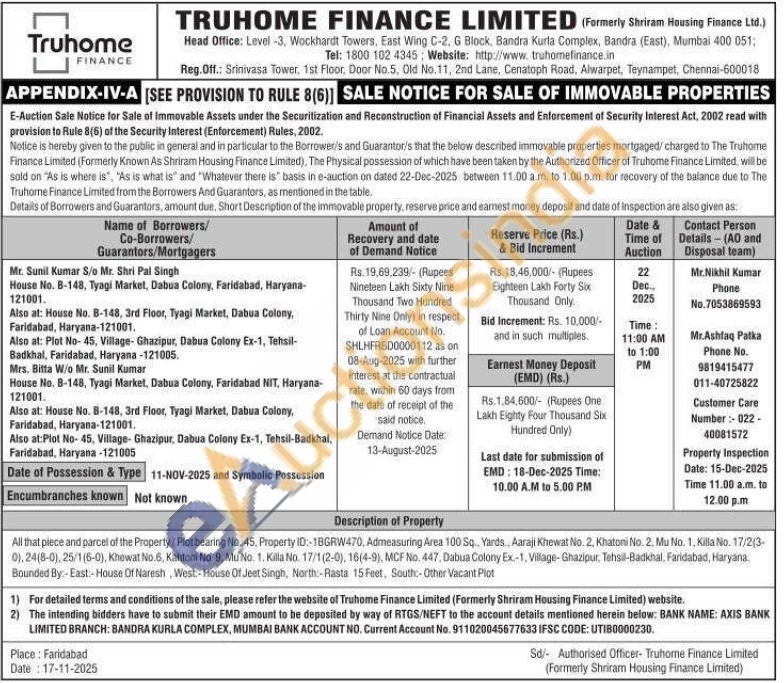 All that piece and parcel of the Property/Plot bearing No. 45, Property ID: 18GRW470, Admeasuring Area 100 Sq. Yards., Aaraji Khewat No. 2, Khatoni No. 2. Mu No. 1. Killa No. 17/2(3-0), 24(8-0), 25/1(6-0), Khewat No.6, Kahtoni No. 9. Mu No. 1. Killa No. 17/1 (2-0), 16(4-9), MCF No. 447, Dabua Colony Ex-1, Village-Ghazipur, Tehsil-Badkhal, Faridabad, Haryana Bounded By:-East:-House Of Naresh West House Of Jeet Singh, North:-Rasta 15 Feet, South-Other Vacant Plot
