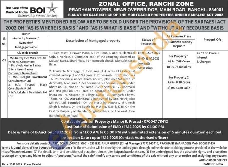 1. Fixed asset (1. Power Plant, 2. Rice Plant, 3. OFA, 4. Electrical Unit, 5. Vehicle, 6 Computer etc.) of the company situated at Mouza- Dakra, Sirari Road, PS-Ramgarh chowk, Dist-Lakhisarai Bihar