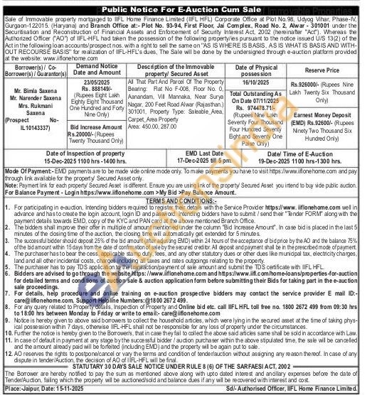 All That Part And Parcel Of The Property Bearing: Flat No F-008, Floor No. 0 Aanandam, VII Mannaka. Near Surya Nagar, 200 Feet Road Alwar (Rajasthan.) 301001, Property Type: Saleable Area Carpet Area Property Area 450.00.287.00
