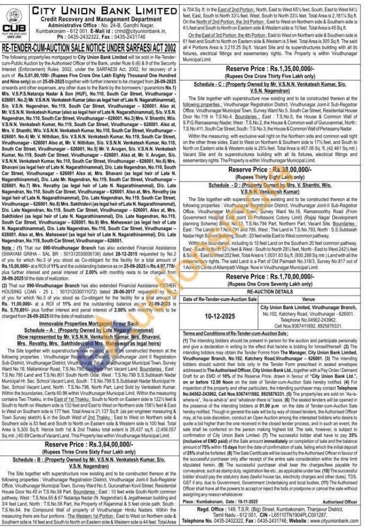 The Site together with superstructure now existing and to be constructed thereon at the following properties Virudhunagar Registration District, Virudhunagar Joint-li Sub-Registrar Office, Virudhunagar Municipal Town, Survey Ward No.5. Gurunathan Kovil Street, Residential House Door No.45 in T.S.No.56 Part Boundaries East: 10 feet wide South-North common pathway West: TS Nos 65 & 67 Nataraja Nadar (N. Nagendran) & Jegatheesan building and 314 feet Land, North T.S.No. 58 Part, the Property of Rajammal & 5 feet circle path, South TS No. 64, the Compound Vall of property of Virudhunagar Hindu Nadars. Within the measuring there are four portions: The Westem 1st Portion East to West on Northem side & Southern side is 16 feet and South to North on Eastern side & Westem side is 44 feet. Total Area704 Soft in the East of 2nd Portion, North, East to West 65% feet, South, East to West 64% feet, East, South to North 33% feet, West, South to North 33% feet. Total Area is 2.161% Sqft. On the North of 2nd Portion, the 3rd Portion: East to West on Northem side & Southern side is 4% feet and South to North on Eastern side & Western side is 10 feet. Total Area is 45 Sq ft.On the East of Ind Portion, the 4th Portion, East to Weston Northern side & Southern side is 61 feet and South to North on Eastern side & Western is 5 feet. Total Area is 305 Sqft. The said all 4 Portions Area is 3.215.25 Sq. Vacant Site and its superstructures building with all its fixtures, electrical fittings and easementary rights. The Property is within Virudhunagar Municipal Limit
