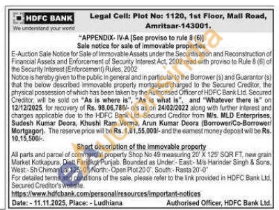 All parts and parcel of commercial property Shop No 49 measuring 20 X 125 SQR FT, new grain Market Kotkapura, Distt Faridkot Punjab, Bounded as Under-East-Mis Harinder Singh & Sons, West-Sh Chiman Lal 125-0, North: Open Plot 200 South Rasta 20-0 For detailed terms and conditions of the sale,