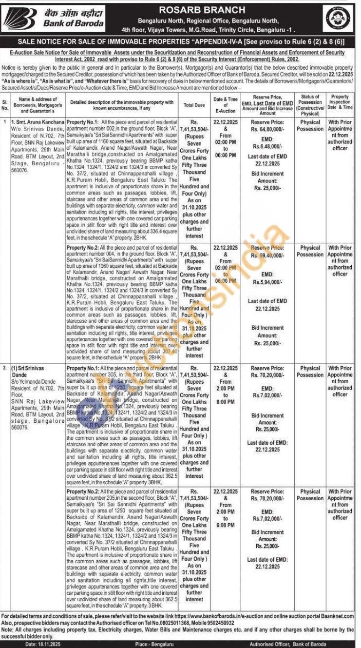 Property No.2: At the plece and parcel of residentur apartment number 004, in the ground floor, Block "A". T Samakyaa's "Sn SalSannidhi Apartments with super buit up area of 1060 square feet, situated at Backside of Kalamandie, Anand Nagar Aswath Nagar. Near Marathalli bridge, constructed on Amalgamated Khatha No. 1324, previously beaning BBMP kathe No.1324, 1324/1, 132412 and 1324/3 in converted Sy No. 37/2, situated at Chinnappanahali village K.R. Param Hobil, Bengaluru East Taluku. The apartment is inclusive of proportionate share in the H common areas such as passages, lobbies, starecase and other areas of common area and the buildings with separate electricity, common water and sanitation including all nights, tile interest, privileges apportenances together with one coversed car parking space in stilt foor with night title and interest aver undivided share of land measuring about 307.40 square feet, in the schedule 'A'property 28HK