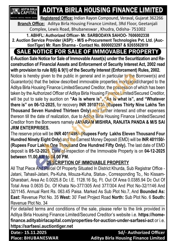 All That Piece And Parcel Of Property Situated In District Khurda, Sub Registrar Office -Jatani, Tahasil-Jatani, Ps-Kuha, Mouza-Kuha, Status-, Corresponding To,, No Kissam-Gharabari, Area Ac 0.0025.8 Dc I.E. 1128.16 Sq. Ft. Out Of Area 0.0385.94 Dc Out Of Total Area 0.0635 Dc. Of Khata No-377/305 And 377/304 And Plot No-32/1146 And 32/1145. Annual Rent Rs. 063.45 Paisa. Marked As Sub Plot No.7, And Bounded As: East: Revenue Plot No. 35 West: 30' Feet Project Road North: Sub Plot No. 6 South: Revenue Plot No. 34