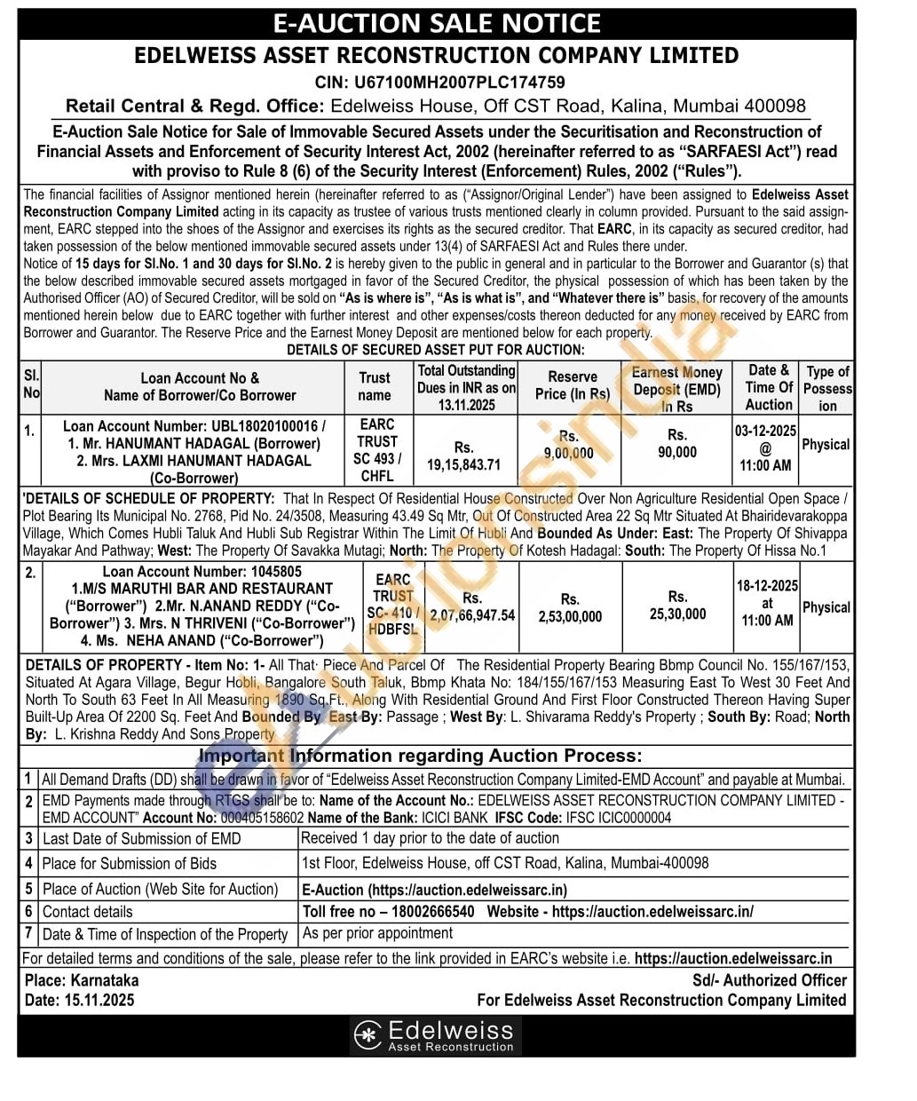 'DETAILS OF SCHEDULE OF PROPERTY: That In Respect Of Residential House Constructed Over Non Agriculture Residential Open Space /Plot Bearing Its Municipal No. 2768, Pid No. 24/3508, Measuring 43.49 Sq Mtr, Out Of Constructed Area 22 Sq Mtr Situated At Bhairidevarakoppa Village, Which Comes Hubli Taluk And Hubli Sub Registrar Within The Limit Of Hubli And Bounded As Under: East: The Property Of Shivappa Mayakar And Pathway; West: The Property Of Savakka Mutagi; North: The Property Of Kotesh Hadagal: South: The Property Of Hissa No.1
