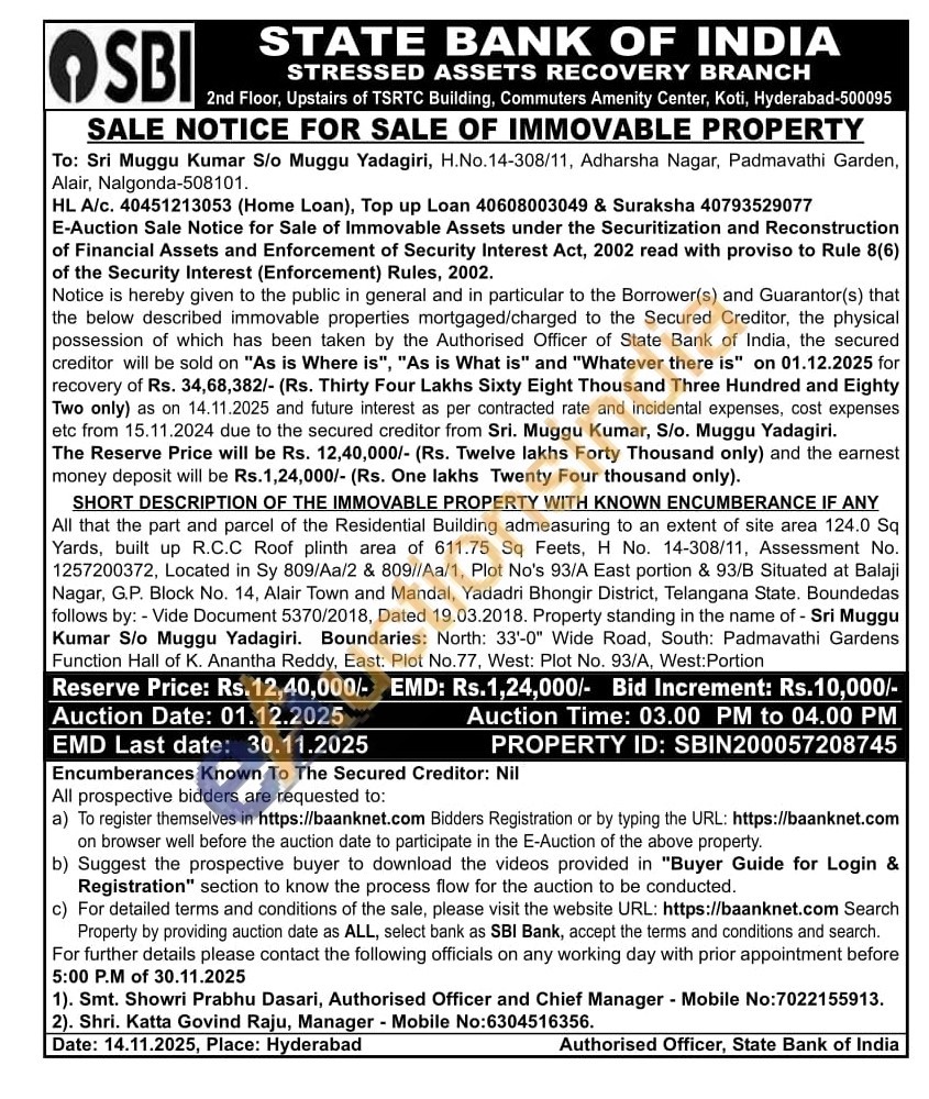All that the part and parcel of the Residential Building admeasuring to an extent of site area 124.0 Sq Yards, built up R.C.C Roof plinth area of 611.75 Sq Feets, H No. 14-308/11, Assessment No. 1257200372, Located in Sy 809/Aa/2 & 809//Aa/1, Plot No's 93/A East portion & 93/B Situated at Balaji Nagar, G.P. Block No. 14, Alair Town and Mandal, Yadadri Bhongir District, Telangana State. Boundedas follows by: - Vide Document 5370/2018, Dated 19.03.2018. Property standing in the name of - Sri Muggu Kumar S/o Muggu Yadagiri. Boundaries: North: 33'-0" Wide Road, South: Padmavathi Gardens Function Hall of K. Anantha Reddy, East: Plot No.77, West: Plot No. 93/A, West: Portion
