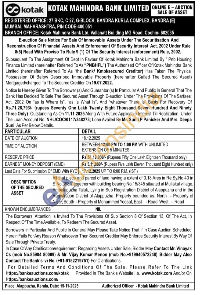 All that piece and parcel of land having a extent of 3.18 Ares in Re.Sy.No.40 in S.No.398/7 together with building bearing No. 15/345 situated at Mullakal village, Ambalapuzha Taluk, Lying in Sub Registration District of Alappuzha and in the Registration District of Alappuzha. Property bounded as: North Nisar, South-Property of Mohammed Yoosaf, East Road, West Property of Road