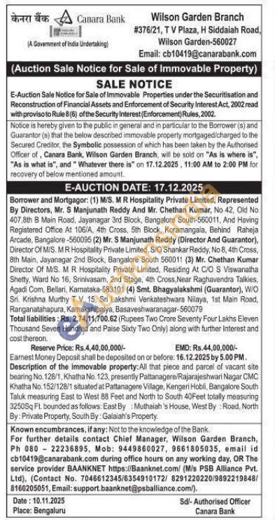 All that piece and parcel of vacant site bearing No. 128/1, Khatha No. 123, presently Pattanagere/Rajarajeshwari Nagar CMC Khatha No. 152/128/1 situated at Pattanagere Village, Kengeri Hobli, Bangalore South Taluk measuring East to West 88 Feet and North to South 40Feet totally measuring 3250Sq Fl. bounded as follows: East By: Muthaiah's House, West By: Road, North By: Private Property, South By: Galalah's Property.