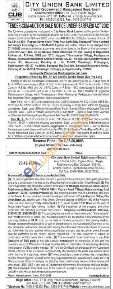 Factory of Mis. Sri Sai Basava Tarakarama Oils Pvt Ltd., bearing D.No. 5-13 in an Area of Ac. 4.50 Cants comprising of (1) Ac. 4.12% Cerits comprising of Ac. 3.55 Cents out of Ac. 3.92% Cents in R.S.No. 156/2 and Ac. 0.57% Cents in R.S.No. 157/2 constituting in Single Item and (2) Ac. 0.37% Cents out of Ac. 7.85 Cents in R.S. No. 156/2 situated at Jagganna Thimmapuram Village, within Thimmapuram Gram Panchayat, Peddapuram Mandal within Sub-Registrar Office, Jaggampeta, East Godavari District