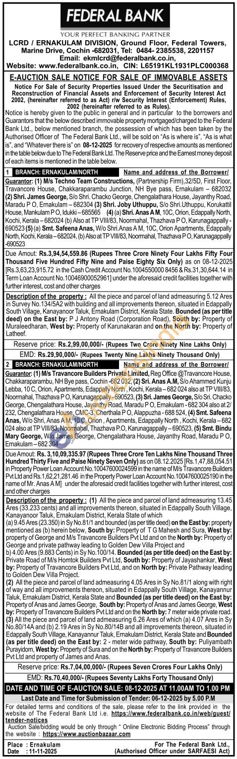 Description of the property: All the piece and parcel of land admeasuring 5.12 Ares in Survey No. 134/5A2 with building and all improvements thereon, situated in Edappally South Village, Kanayanoor Taluk, Ernakulam District, Kerala State. Bounded (as per title deed) on the East by: P J Antony Road (Corporation Road), South by: Property of Muraleedharan, West by: Property of Karunakaran and on the North by: Property of Latheef