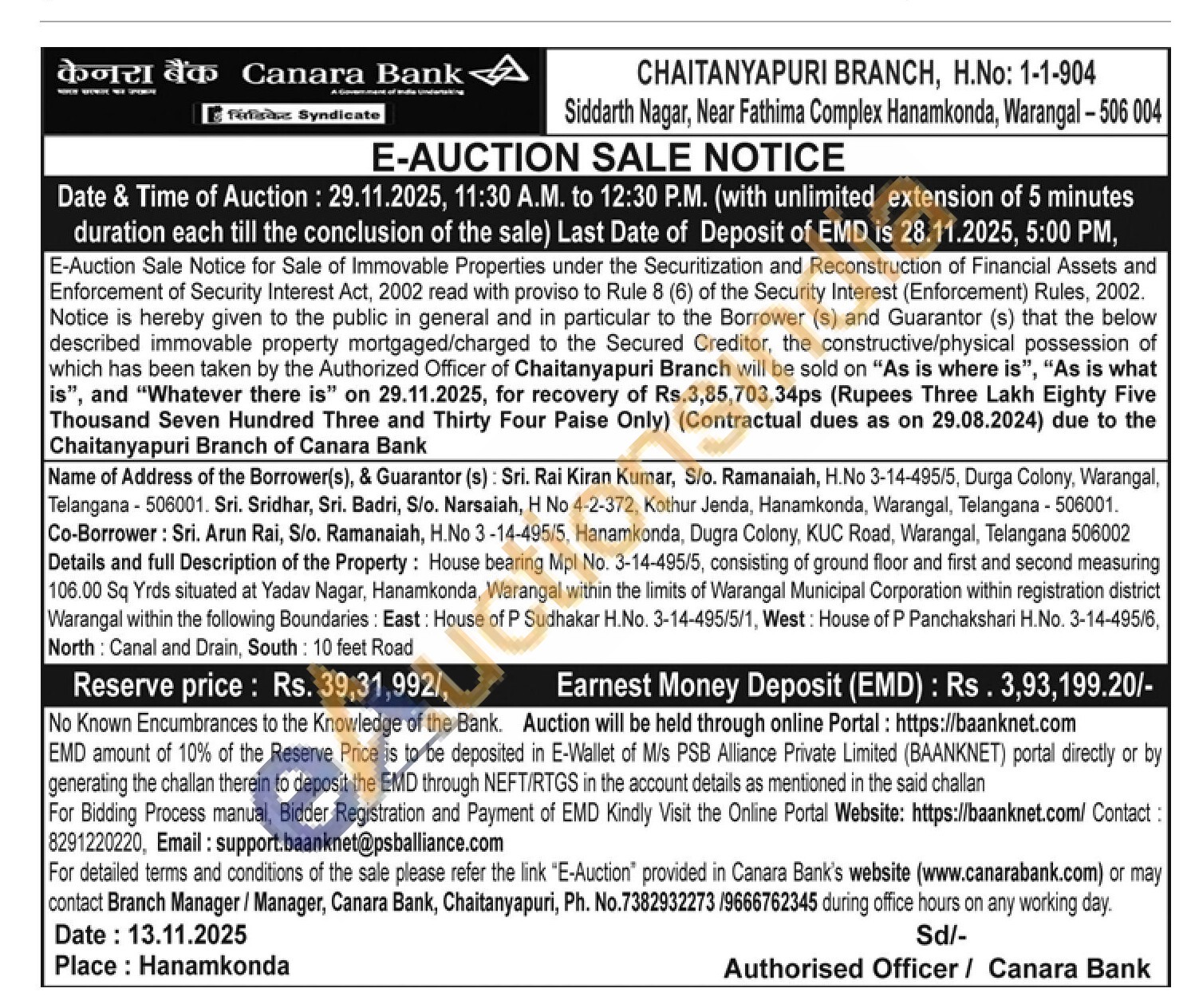 House bearing Mpl No. 3-14-495/5, consisting of ground floor and first and second measuring 106.00 Sq Yrds situated at Yadav Nagar, Hanamkonda, Warangal within the limits of Warangal Municipal Corporation within registration district Warangal within the following Boundaries: East: House of P Sudhakar H.No. 3-14-495/5/1, West: House of P Panchakshari H.No. 3-14-495/6, North: Canal and Drain, South: 10 feet Road
