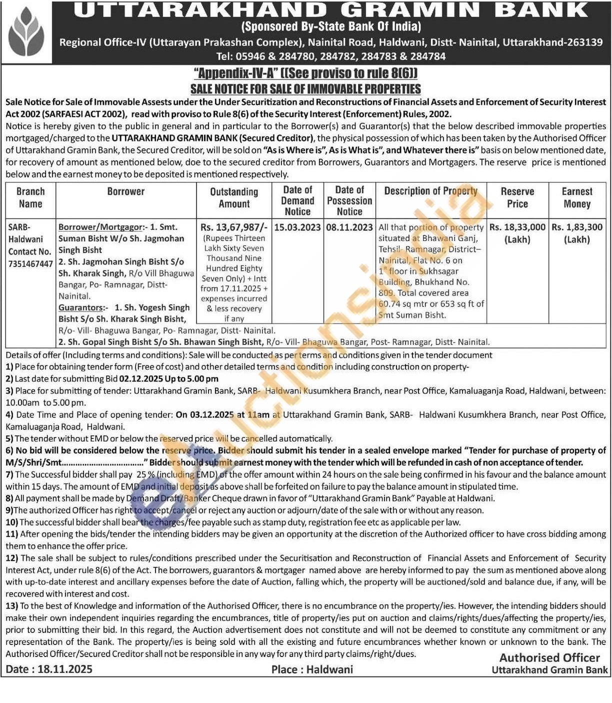 All that portion of property situated at Bhawani Ganj, Tehsil- Ramnagar, District-Nainital, Flat No. 6 on 1" floor in Sukhsagar Building, Bhukhand No. 809. Total covered area 60.74 sq mtr or 653 sq ft of Smt Suman Bisht.