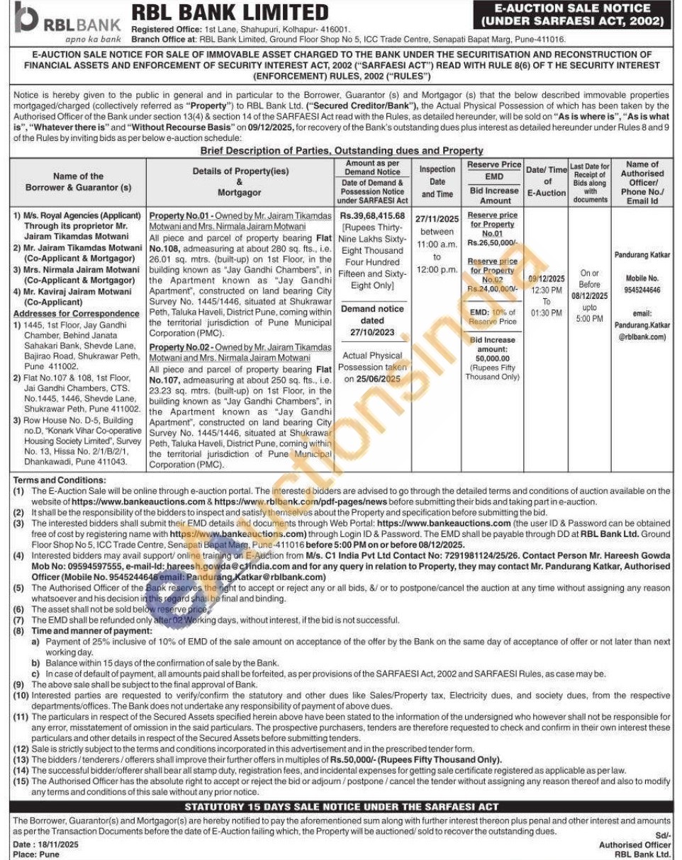 Property No.01-Owned by Mr. Jairam Tikamdas Motwani and Mrs. Nirmala Jairam Motwani All piece and parcel of property bearing Flat No.108, admeasuring at about 280 sq. fts, i.e. 26.01 sq. mtrs. (built-up) on 1st Floor, in the building known as "Jay Gandhi Chambers", in the Apartment known as "Jay Gandhi Apartment, constructed on land bearing City Survey No. 1445/1446, situated at Shukrawar Path, Taluka Haveli, District Pune, coming within the territorial jurisdiction of Pune Municipal Corporation (PMC).