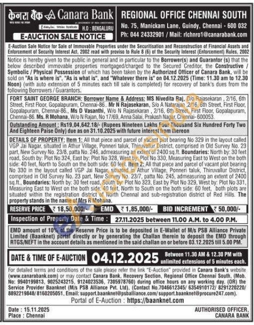 DETAILS OF PROPERTY: Item 1: All that piece and parcel of vacant plot bearing No 329 in the layout called VGP Jai Nagar, situated in Athur Village, Ponneri taluk, Thiruvallur District, comprised in Old Survey No. 23 part, New Survey No. 23/8, patta No. 246, admeasuring an extent of 2400 sq.ft. Boundaries: North by: 30 feet road, South by: Plot No 324, East by: Plot No 328, West by: Plot No 330, Measuring East to West on the both side: 40 feet, North to South on the both side: 60 feet. Item 2: All that piece and parcel of vacant plot bearing No 330 in the layout called VGP Jai Nagar, situated in Athur Village, Ponneri taluk, Thiruvallur District, comprised in Old Survey No. 23 part, New Survey No. 23/7, patta No. 245, admeasuring an extent of 2400 sq.ft., Boundaries: North by: 30 feet road, South by: Plot No 323, East by Plot No 329, West by. Plot No 331, Measuring East to West on the both side. 40 feet, North to South on the both side: 60 feet, both plots are situated within the registration district of North Chennal and sub-registration district of Red Hills. The property stands in the name of Mrs R Mohana.
