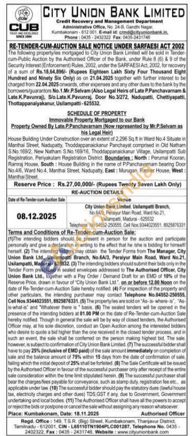 House Building Under Construction over an extent of 2.296 Sq. ft in Ward No.4 Situate in Manthai Street, Nadupatty, Thoddappanaickanur Panchayat comprised in Old Natham S.No.169/2, New Natham S.No. 169/16, Thoddappanaickanur Village, Usilampatti Sub Registration, Periyakulam Registration District. Boundaries; North: Perumal Kooran, Ramraj House, South: House Building in the name of P.Panchavanam bearing Door No.4/5, Ward No.4, Manthai Street, Nadupatty, East: Murugan, Panner House, West: Manthai Street.