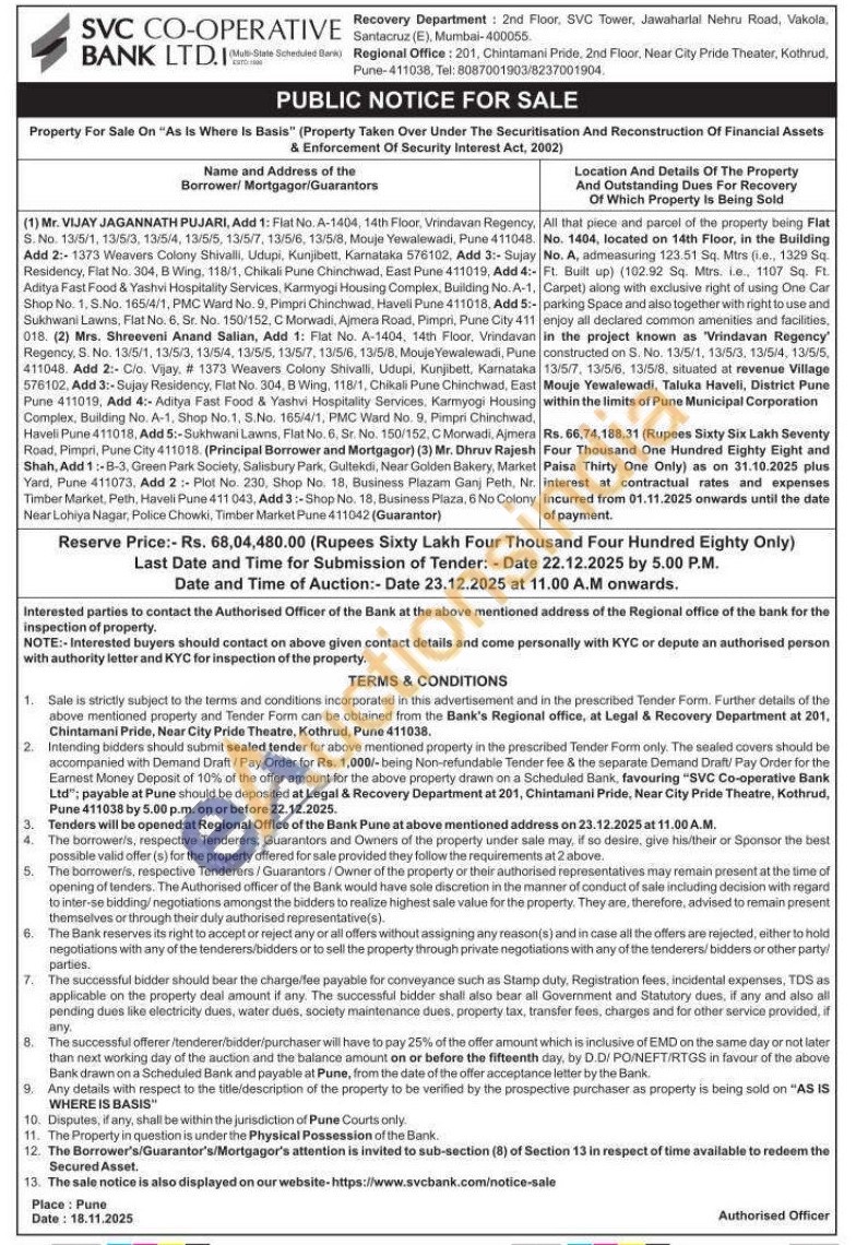All that piece and parcel of the property being Flat No. 1404, located on 14th Floor, in the Building No. A, admeasuring 123.51 Sq. Mtrs (ie., 1329 Sq. Ft. Built up) (102.92 Sq. Mtrs. Le, 1107 Sq. Ft. Carpetj along with exclusive right of using One Car parking Space and also together with right to use and enjoy all declared common amenities and facilities, in the project known as "Vrindavan Regency constructed on S. No. 13/5/1, 13/5/3, 13/5/4, 13/5/5, 13/5/7, 13/5/6, 13/5/8, situated at revenue Village Mouje Yewalewadi, Taluka Haveli, District Pune within the limits of Pune Municipal Corporation