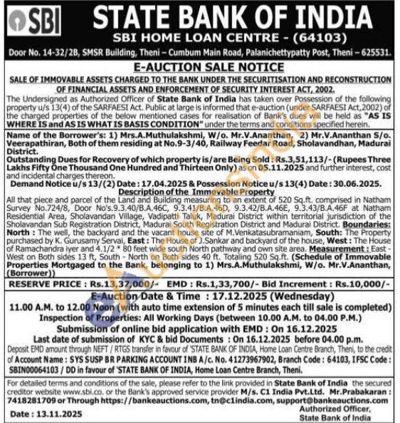 All that piece and parcel of the Land and Building measuring to an extent of 520 Sq.ft. comprised in Natham Survey No.724/8, Door No's.9.3.40/B.A.46C, 9.3.41/B.A.46D, 9.3.42/Β.Α.46Ε, 9.3.43/B.A.46F at Natham Residential Area, Sholavandan Village, Vadipatti Taluk, Madurai District within territorial jurisdiction of the Sholavandan Sub Registration District, Madurai South Registration District and Madurai District. Boundaries: North: The well, the backyard and the vacant house site of M. Venkatasubramaniam, South: The Property purchased by K. Gurusamy Serval, East: The House of J.Sankar and backyard of the house, West: The House of Ramachandra iyer and 4.1/2 80 feet wide south North pathway and own site area. Measurement: East-West on Both sides 13 ft, South North on Both sides 40 ft. Totaling 520 Sq.ft. (Schedule of Immovable Properties Mortgaged to the Bank, belonging to 1) Mrs.A.Muthulakshmi, W/o. Mr.V.Ananthan, (Borrower))