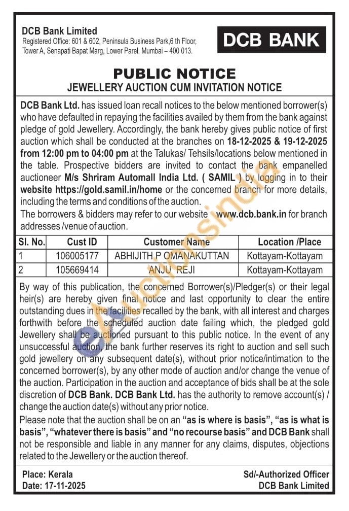 DCB Bank Gold Auctions Auction in Kottayam