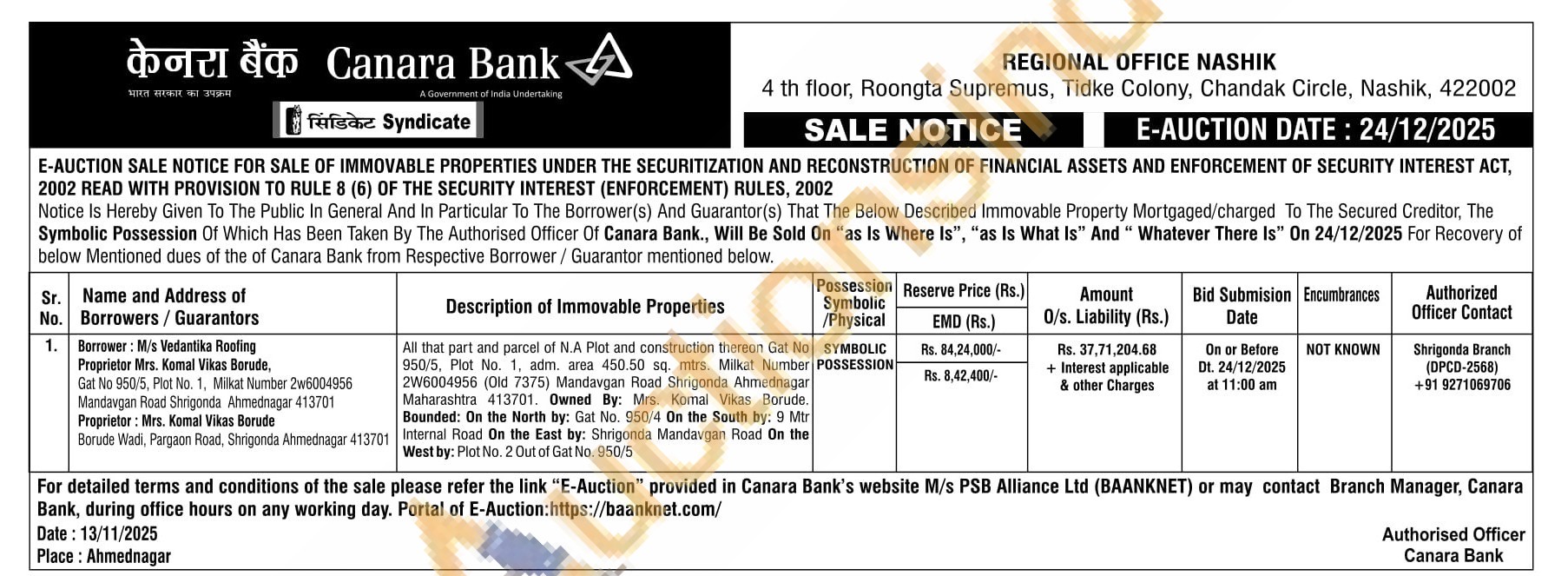 All that part and parcel of N.A Plot and construction thereon Gat No 950/5, Plot No. 1, adm. area 450.50 sq. mtrs. Milkat Number 2W6004956 (Old 7375) Mandavgan Road Shrigonda Ahmednagar Maharashtra 413701. Owned By: Mrs. Komal Vikas Borude. Bounded: On the North by: Gat No. 950/4 On the South by: 9 Mtr Internal Road On the East by: Shrigonda Mandavgan Road On the West by: Plot No. 2 Out of Gat No. 950/5