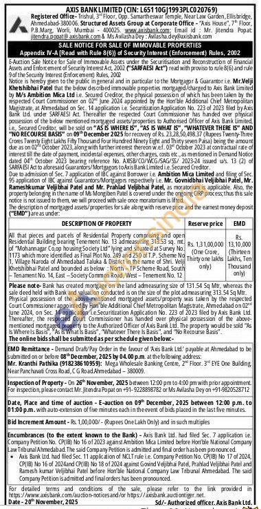All that pieces and parcels of Residential Property comprising and open Residential Building bearing Tenement No. 13 admeasuring 313.53 sq. mt. of "Mohannagar Co,op housing Society Ltd" lying and situated at Survey No. 1173 which more identified as Final Plot No. 249 and 250 of T.P. Scheme No 1, Willage Naroda of Ahmedabad Taluka & District in the name of Shri. Veli Khetshibhai Patel and bounded as below: North -TP Scheme Road, South -Tenament No. 14, East-Society Common Road, West - Tenement No. 12
