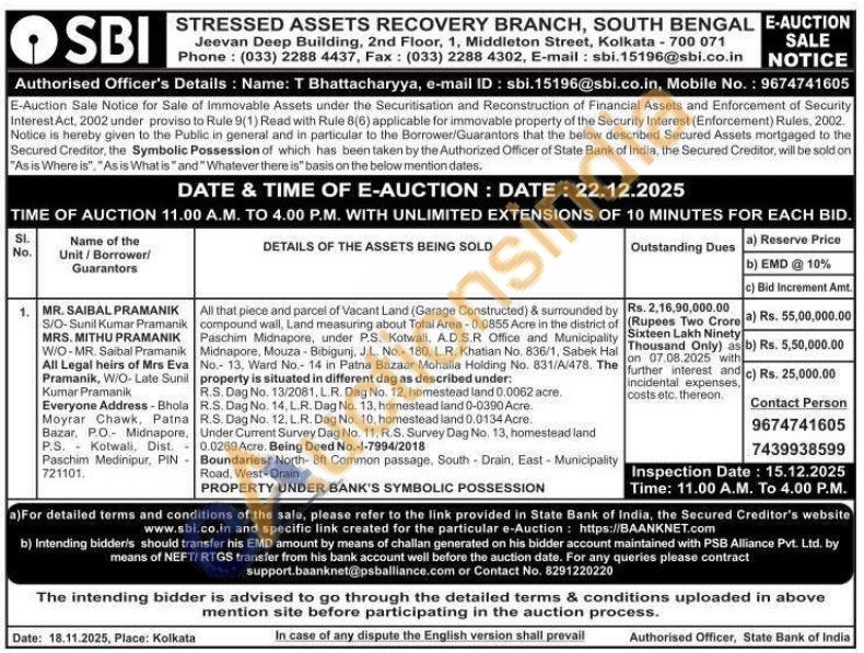 All that piece and parcel of Vacant Land (Garage Constructed) & surrounded by compound wall, Land measuring about Total Area -0.0855 Acre in the district of Paschim Midnapore, under P.S. Kotwali, A.D.S.R Office and Municipality Midnapore, Mouza-Bibigunj, J.L. No.- 180, L.R. Khatian No. 836/1, Sabek Hai No.- 13, Ward No.- 14 in Patna Bazaar Mohalla Holding No. 831/A/478. The property is situated in different dag as described under: R.S. Dag No. 13/2081, L.R. Dag No. 12, homestead land 0.0062 acre. R.S. Dag No. 14, L.R. Dag No. 13, homestead land 0-0390 Acre R.S. Dag No. 12. L.R. Dag No. 10, homestead land 0.0134 Acre Under Current Survey Dag No. 11. R.S. Survey Dag No. 13, homestead land 0.0269 Acre. Being Deed No.-1-7994/2018 Boundaries: North-8ft Common passage, South Drain, East - Municipality Road, West-Drain.