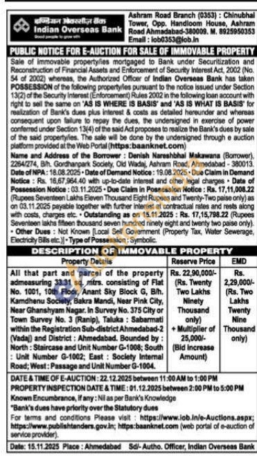 All that part and parcel of the property admeasuring 33.31 sq. mirs. consisting of Flat No. 1001, 10th Floor, Anant Sky Block G, B/h. Kamdhenu Society, Bakra Mandi, Near Pink City, Near Ghanshyam Nagar. In Survey No. 375 City or Town Survey No. 3 (Ranip), Taluka: Sabarmati within the Registration Sub-district Ahmedabad-2 (Vadaj) and District: Ahmedabad. Bounded by: North: Staircase and Unit Number G-1008; South Unit Number G-1002; East: Society Internal Road; West: Passage and Unit Number G-1004.
