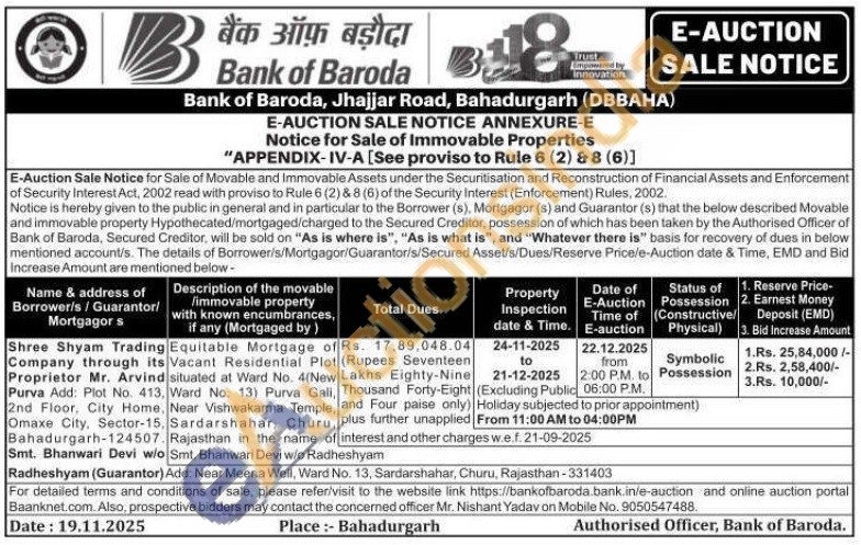 Equitable Mortgage of Vacant Residential Plot situated at Ward No. 4(New Ward No. 13) Purva Gali Near Vishwakarma Temple Sardarshahar, Churu, Rajasthan in the name of Smt. Bhanwari Devi w/o Radheshyam